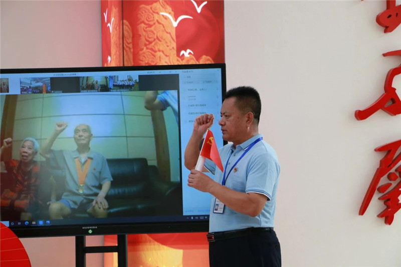 公司黨委書記王吉才領誓,機械院全體黨員重溫入黨誓詞,老黨員吳家修通過視頻連線同步重溫入黨誓詞。