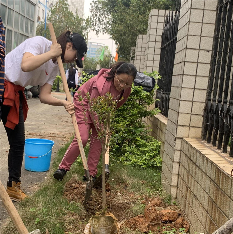 活動現場,大家熱情高漲,擼起袖子,配合默契,認真種下每一株花木,有的揮鍬鏟土,有的扶正壓實,有的填土澆灌,泥土粘到了褲腳,汗水掛在了臉上,植樹現場一片熱火朝天的景象。