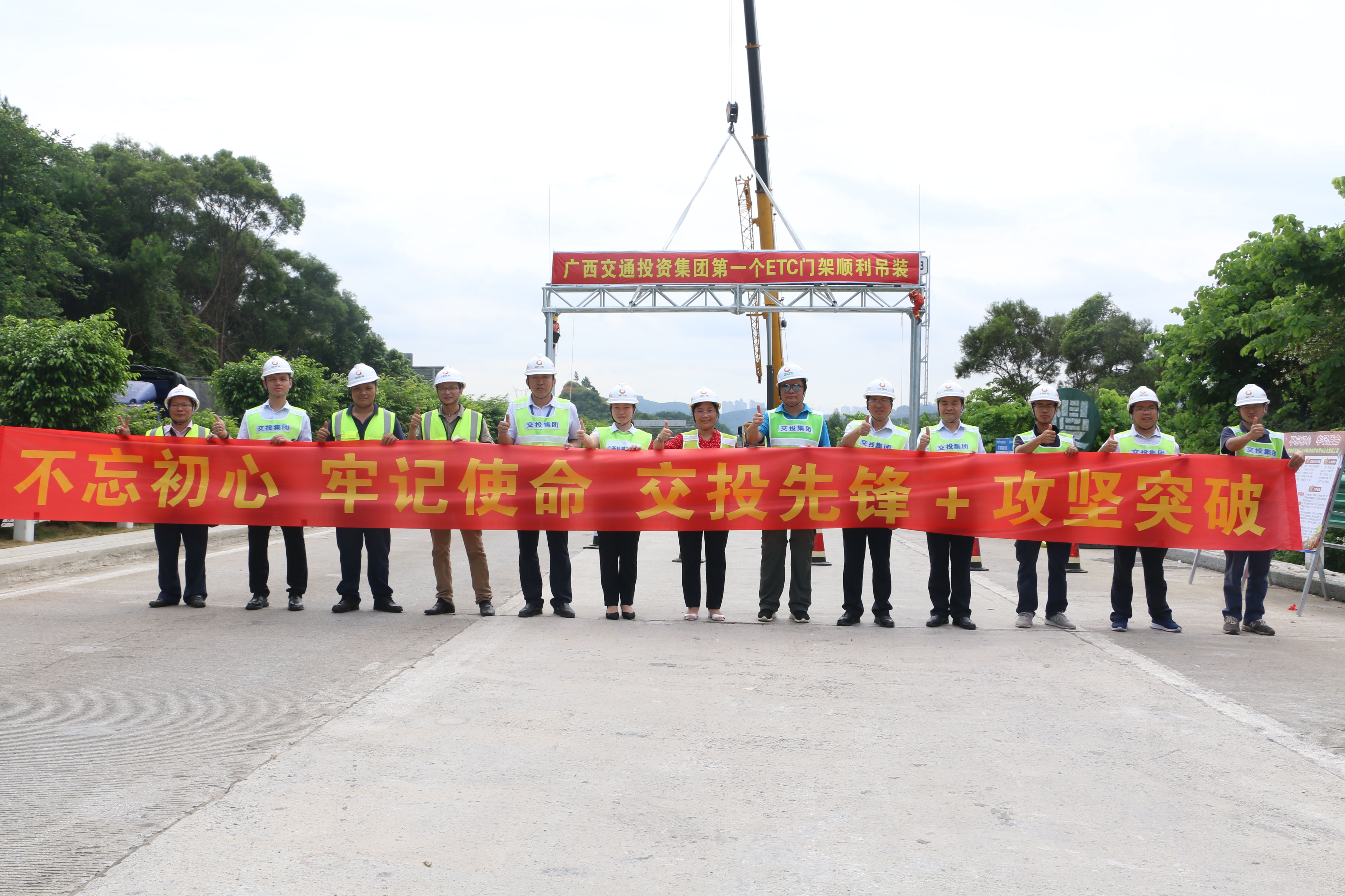 2019年7月23日,廣西交通投資集團有限公司(以下簡稱交投集團)取消高速公路省界收費站應急搶險工程第一個ETC門架在南寧片區五象西至高嶺高速路段K45+500處順利吊裝,交投集團副總經理周志剛親自到現場指揮吊裝工作,集團公司運營部、南寧運營公司、交投科技公司、智通公司、計算中心、機械院公司、廣西交科院等有關單位代表到場見證。此次ETC門架順利吊裝標志著交投集團自由流虛擬收費站進入關鍵施工階段,也標志著機械院公司生產制作的龍門架成功登陸市場,并為后期的龍門架安裝作了標準化示范。