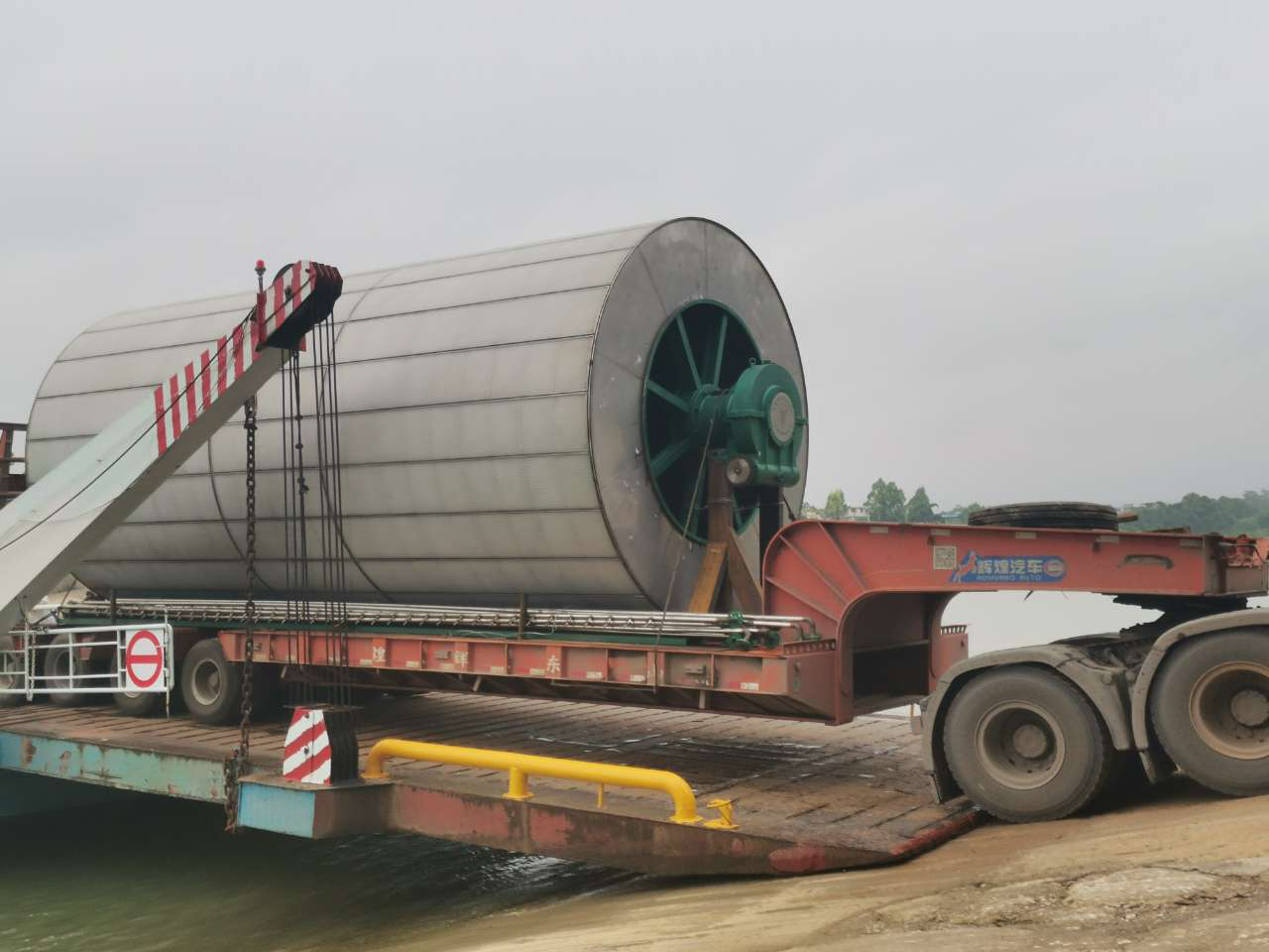 該產品作為超長、超高、超寬的運輸物品,存在極大的運輸安全隱患,項目負責人為確保項目運輸安全,多次帶運輸公司沿路考察,重點研究車輛過渡方案,與運輸公司和渡船公司會商制定詳細的運輸組織方案和應急預案。落實安全督導員全程督導過渡及吊裝施工安全。