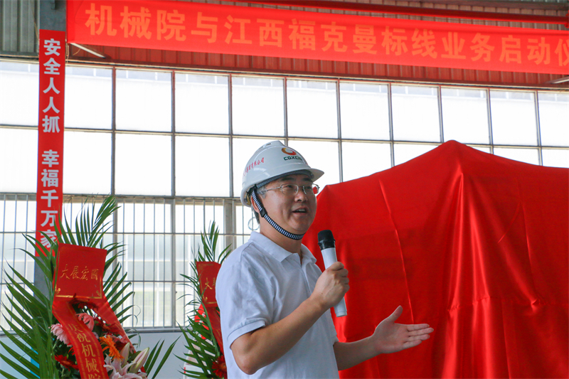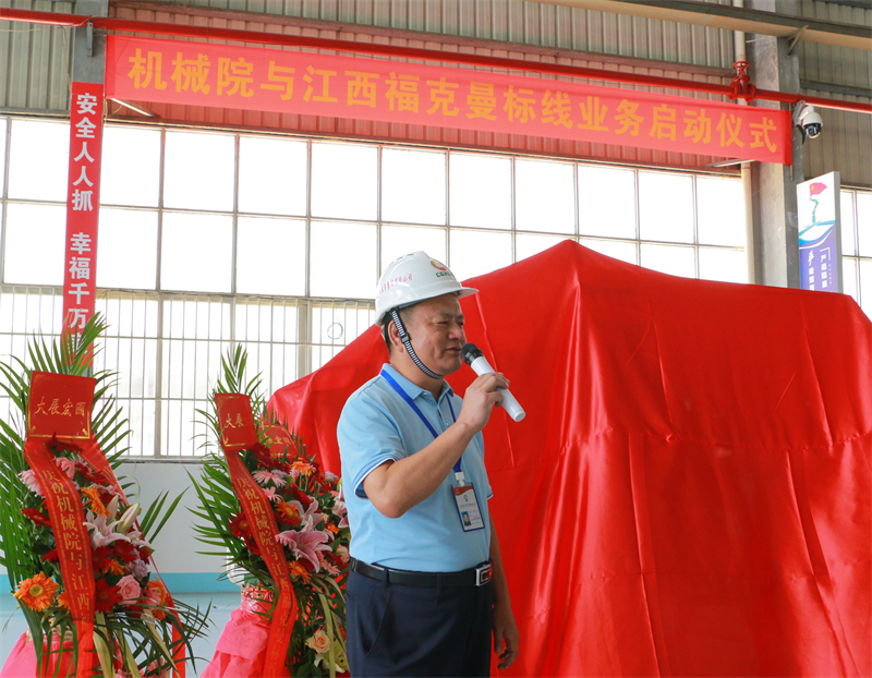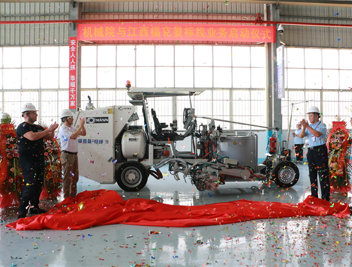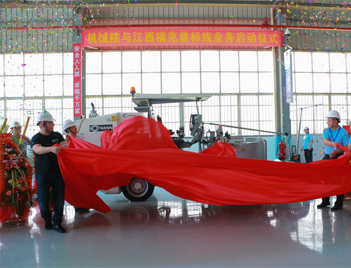 機械院黨委書記、董事長、總經理王吉才和福克曼公司總經理張磊等人在機械院第二車間為全自動熱熔標線機揭幕,機械院領導班子成員、機電工程公司全體員工參加儀式。