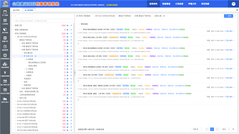 系統(tǒng)設(shè)置了管理性文件上傳、質(zhì)保資料填報與簽批、聲像文件采集等模塊,具有較強的實用性。一是關(guān)聯(lián)度高,檔案管理系統(tǒng)可與各業(yè)務(wù)系統(tǒng)(計量、征拆、試驗等系統(tǒng))實現(xiàn)集成溯源,接收數(shù)據(jù)文件,最終匯總形成案卷總目錄進(jìn)行檔案封裝。二是可實現(xiàn)資料的快速簽批,參建單位質(zhì)保資料全部實現(xiàn)電子簽章線上簽批,有效提高審批效率。三是質(zhì)保資料與現(xiàn)場施工進(jìn)度相同步,其中標(biāo)段質(zhì)保資料模塊、總監(jiān)辦抽檢資料模塊是用戶使用頻次最多的核心模塊,按照用戶反饋不斷加深優(yōu)化,通過wbs(單位分部分項)智能參數(shù)化劃分功能,項目資料填報從手動新增,變成系統(tǒng)自動批量生成,效率提升75%以上。除資料填報效率高的同時,目前系統(tǒng)采用法律認(rèn)可的電子簽章技術(shù),通過標(biāo)準(zhǔn)化數(shù)據(jù)接口,對oa、征拆、計量、質(zhì)量等多個系統(tǒng)數(shù)據(jù)實現(xiàn)一鍵歸檔,效率提升60%以上,極大提高了的工作效率,有效降低了參建單位的人力成本、時間成本、管理成本。四是系統(tǒng)已實現(xiàn)一鍵評定、自動預(yù)組卷、線上案卷封裝等功能;五是實現(xiàn)公路建設(shè)項目電子檔案驗收管理系統(tǒng)的應(yīng)用;六是運維團(tuán)隊能夠及時響應(yīng),由公路、檔案、信息化組成的專業(yè)項目團(tuán)隊線上全年度24小時維護(hù),線下按階段定期上門跟蹤回訪。